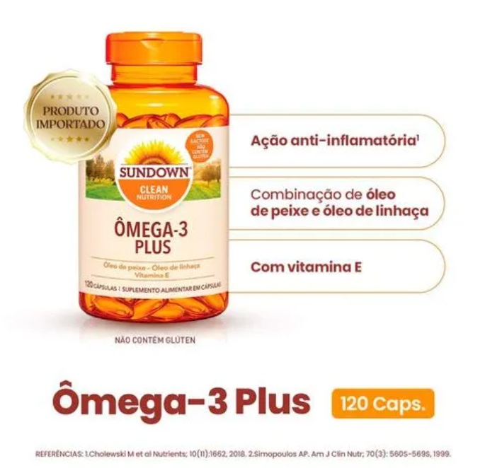Suplemento Alimentar Sundown Ômega-3 Plus é um suplemento vitamínico composto por óleos de peixe, linhaça e borragem, as gorduras boas essenciais para o funcionamento do organismo, contribuindo para a prevenção de doenças cardiovasculares, além de outros benefícios para a saúde. Embalagem com 120 cápsulas.