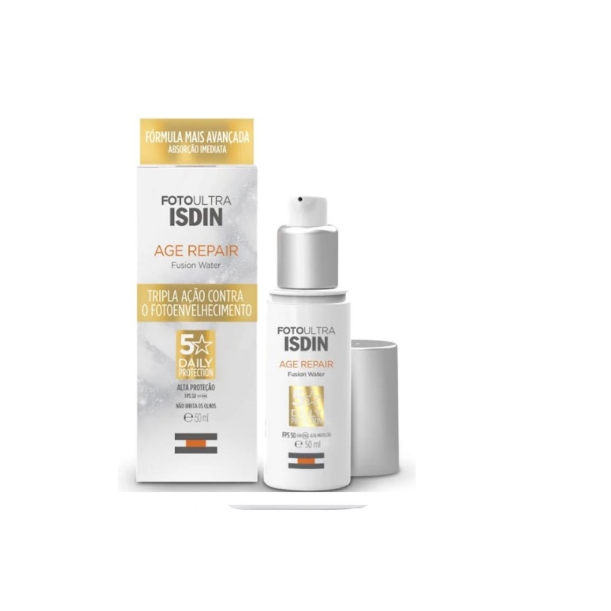 ISDIN Foto Ultra Age Repair 5 Stars FPS 50 é um protetor solar facial em fase aquosa, com tripla ação contra o fotoenvelhecimento e ação antipoluição, textura ultraleve e rápida absorção para uso diário.