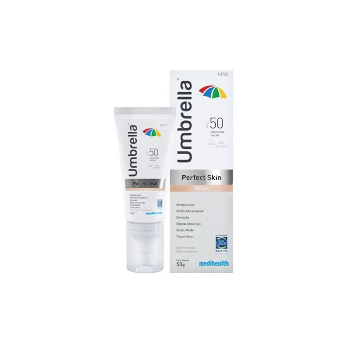 O Umbrella Perfect Skin é um protetor solar da empresa Daudt, que possui um Tom de base Claro perfeito para disfarçar as imperfeições da pele. Além disso, contém fps 50, protegendo você de forma segura e prolongada dos raios UVA, UVB e UVA Longo, principais responsáveis pelo envelhecimento prematuro. O produto auxilia no aumento da síntese do colágeno e elastina, reparando os efeitos causados pela radiação do sol. Tudo isso com um toque de base, disfarçando pequenas imperfeições e deixando sua pele uniforme e suave. QUAL A DIFERENÇA ENTRE OS RAIOS UVA E UVB? Os raios UVAs são os grandes responsáveis pelo envelhecimento prematuro, os UVAs Longos são um subtipo dos UVAs comuns e são responsáveis pela atuação da radiação na camada mais profunda da pele, e causam, além do já citado envelhecimento prematuro, manchas e pigmentações na pele. Já os raios UVBs são os responsáveis pela coloração bronzeada após uma exposição ao sol, contudo também são prejudiciais ao nosso corpo, aumentando o risco de câncer de pele.