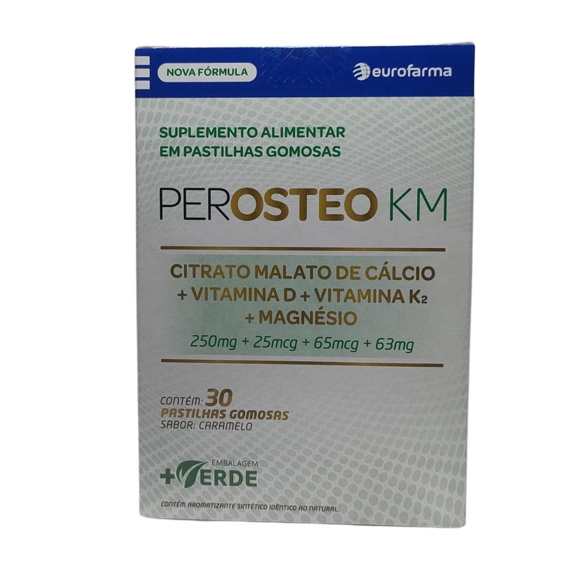 Perosteo KM é um suplemento vitamínico mineral que contribui para a saúde óssea dos adultos. É formulado com nutrientes essenciais que ajudam a prevenir a osteoporose e a reduzir o risco de fraturas, desde que associado a uma dieta equilibrada e hábitos de vida saudáveis. A caixa contém 30 tabletes mastigáveis sabor caramelo.